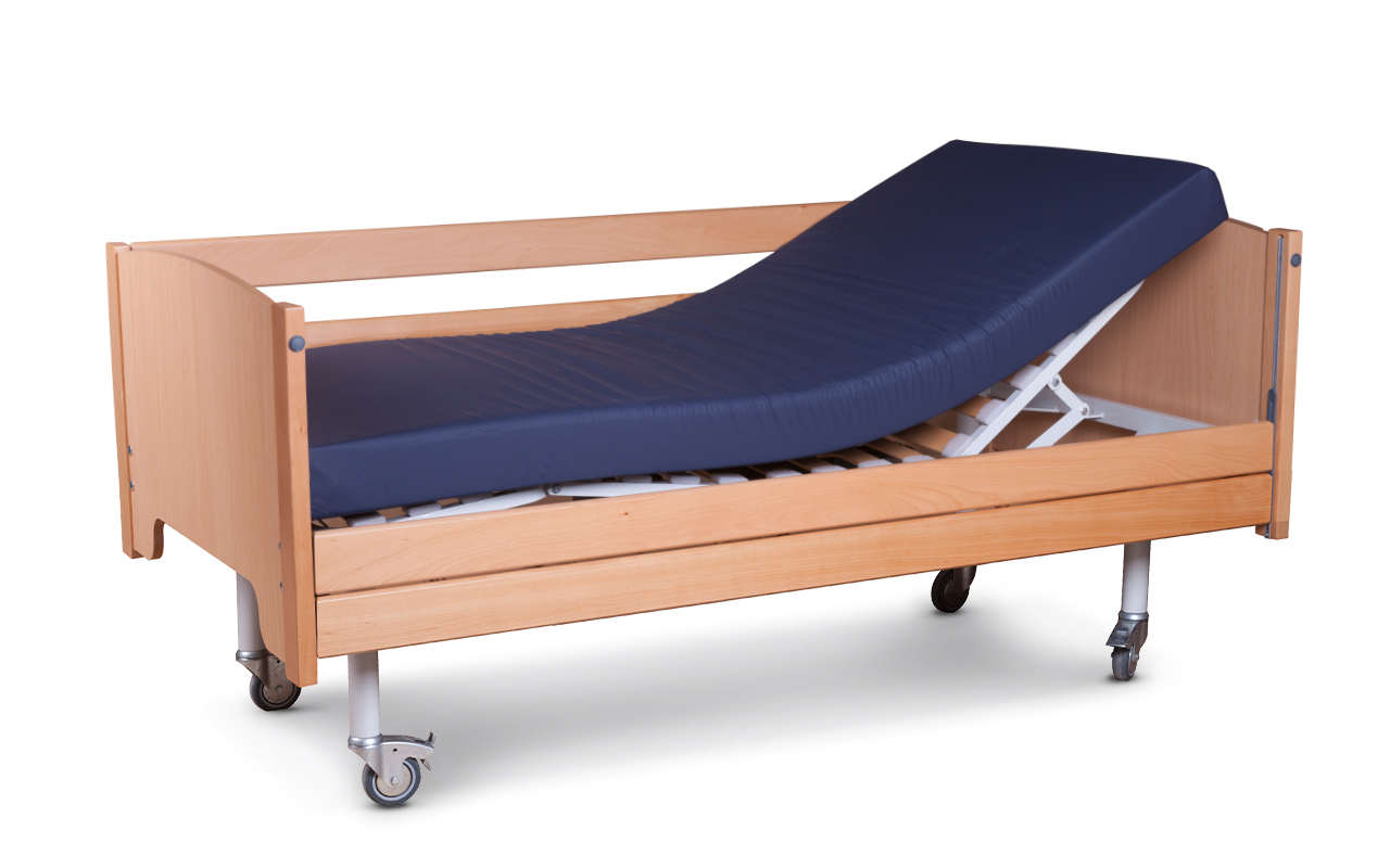 Os pés da cama têm altura fixa com rodas, duas com travão.